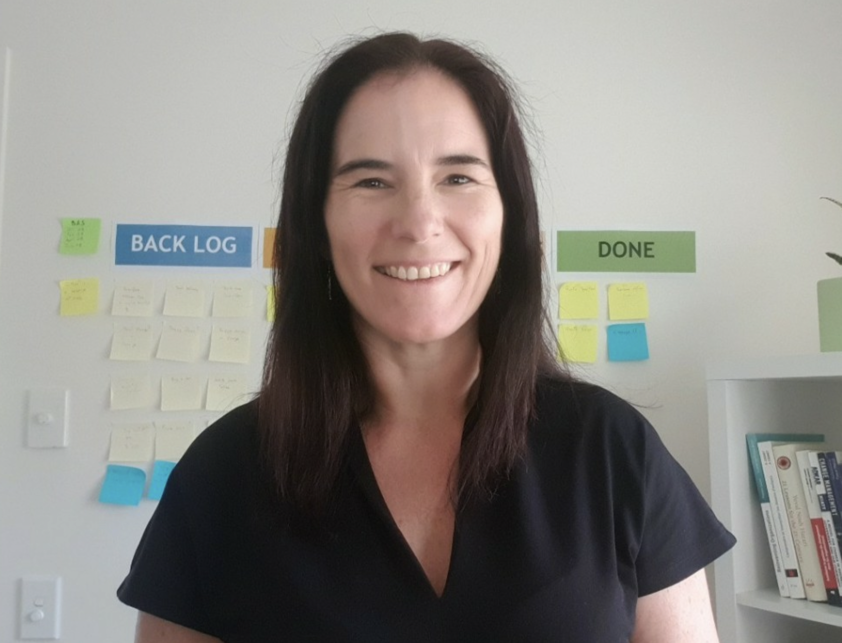 Mariebelle in her home office, complete with analogue Kanban board from the Agile way of working.